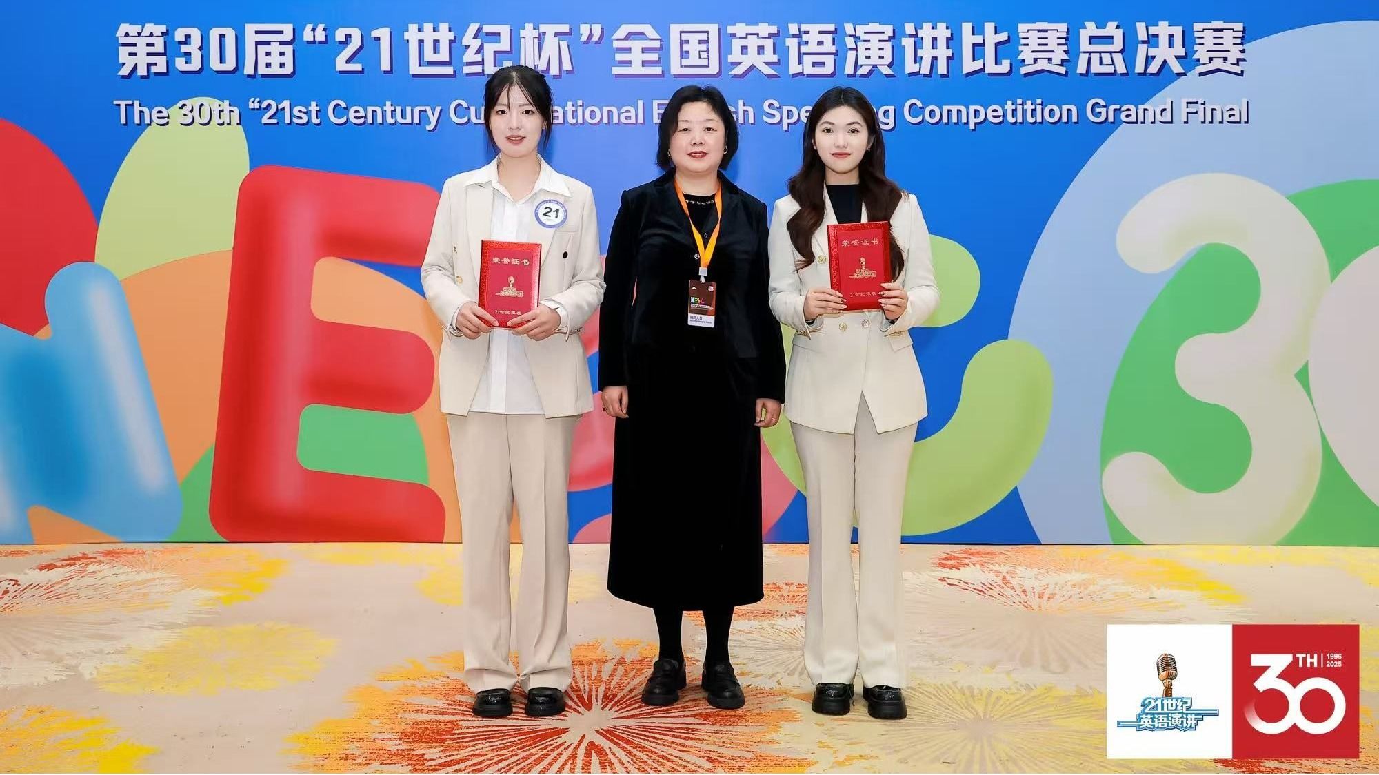 From November 13 to 17, the 30th “21st Century Cup” National English Speaking Competition for College Students was grandly held in Hangzhou. Xu Ziqing, a 2023 English major student, and Chen Ke, a Translation major student from the School of English Language and Culture, competed against 350 contestants from over 100 universities nationwide, including Tsinghua University, FuDan University, and Shanghai International Studies University. With confident expressions and outstanding performances, they won two second prize respectively at the national finals—an unprecedented breakthrough for our university in this competition.