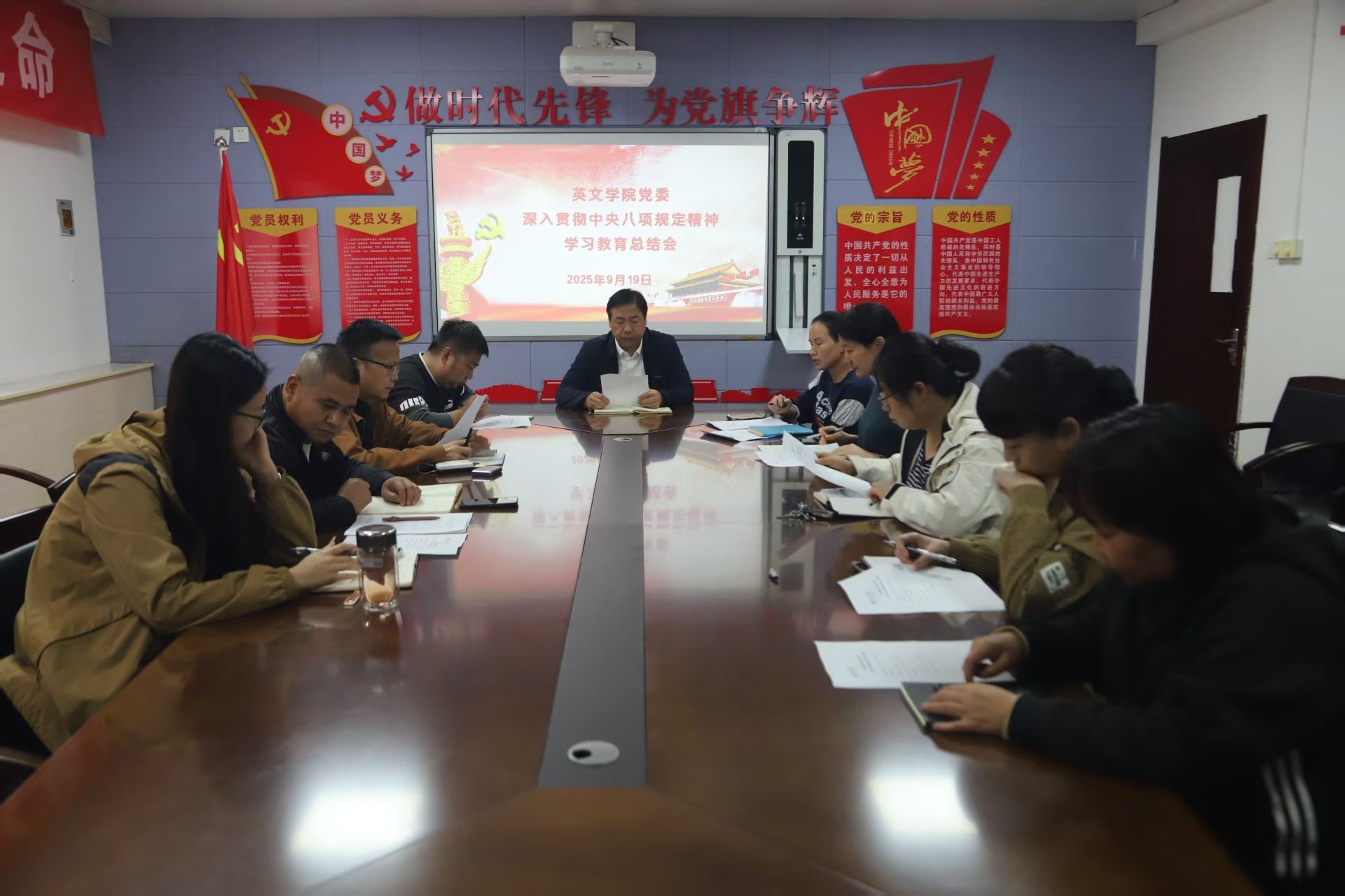 为深入总结中央八项规定精神学习教育开展以来的成效与经验,进一步巩固拓展学习成果,推动学院党建工作与教育教学深度融合,9月19日下午16:30,英文学院在2304党员活动室隆重召开英文学院党委深入贯彻中央八项规定精神学习教育总结会。共同回顾学习历程,梳理工作亮点,谋划下一步发展方向。