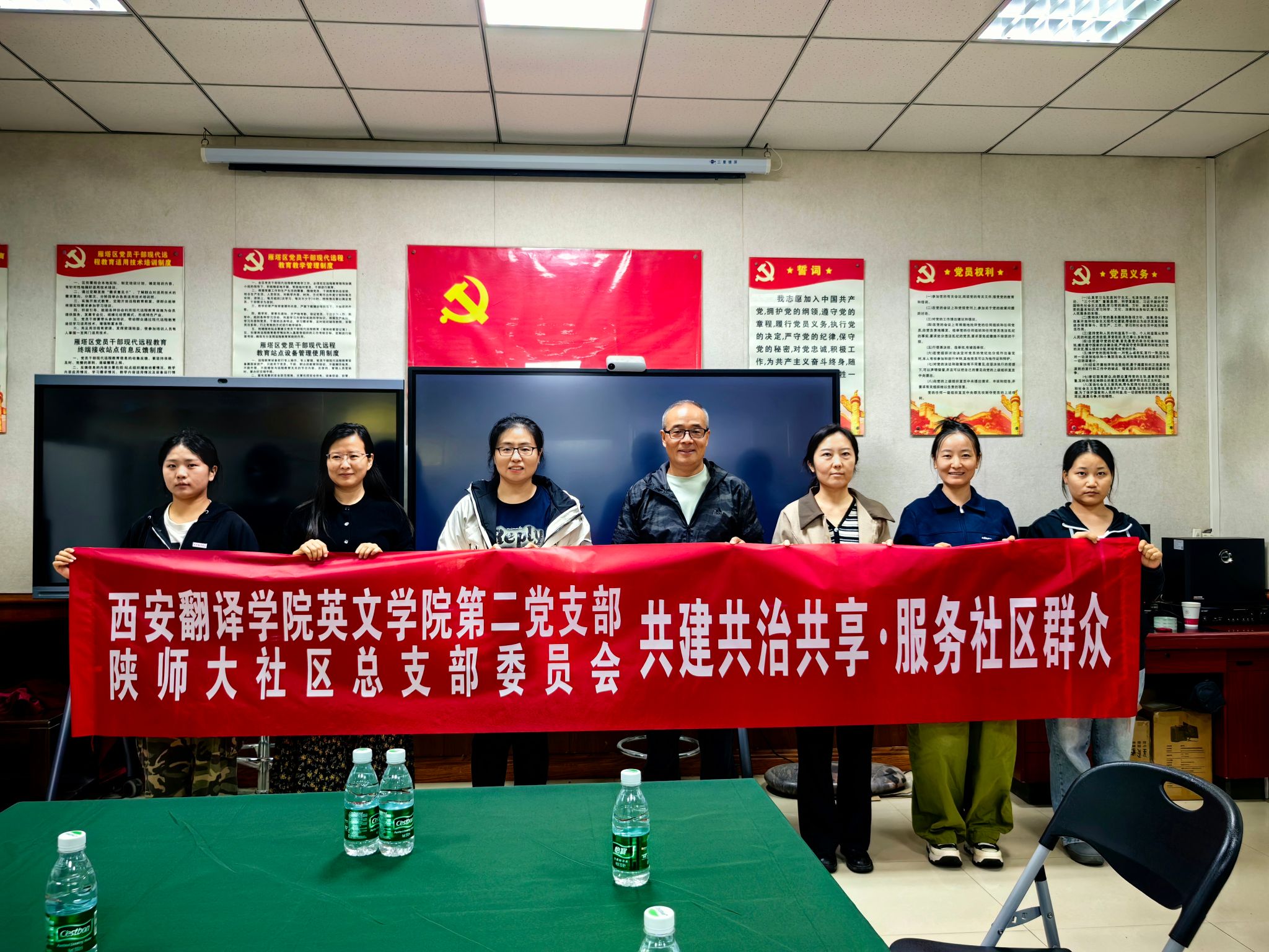 为深入贯彻落实新时代党建共建工作要求,充分发挥基层党组织的战斗堡垒作用和党员的先锋模范作用,2025年9月23日下午,西安翻译学院英文学院第二党支部书记赵铮同志及红色导师姜春兰同志带领优秀学生党员,赴陕西师范大学雁塔校区,与陕师大社区总支部委员会联合开展主题为“共建共治共享·服务社区群众”的共建活动。