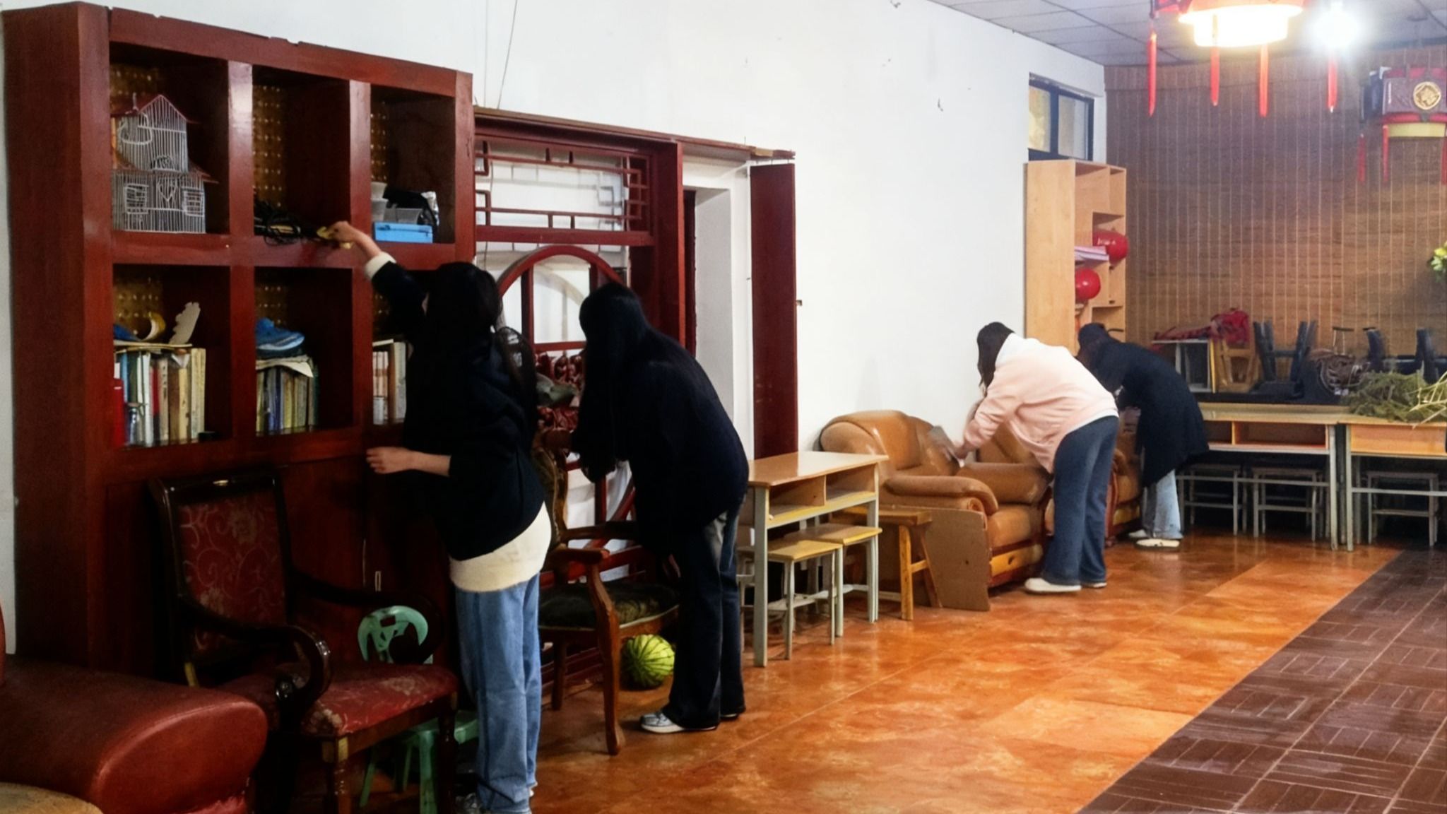 另一组志愿者同步开展“环境焕新”行动:有人擦床头柜、衣柜,有人扫走廊落叶杂物,有人整理晾晒衣物。他们不惧灰尘污渍,细致清理每处细节,让老人居住的房间与走廊迅速变得干净整洁。