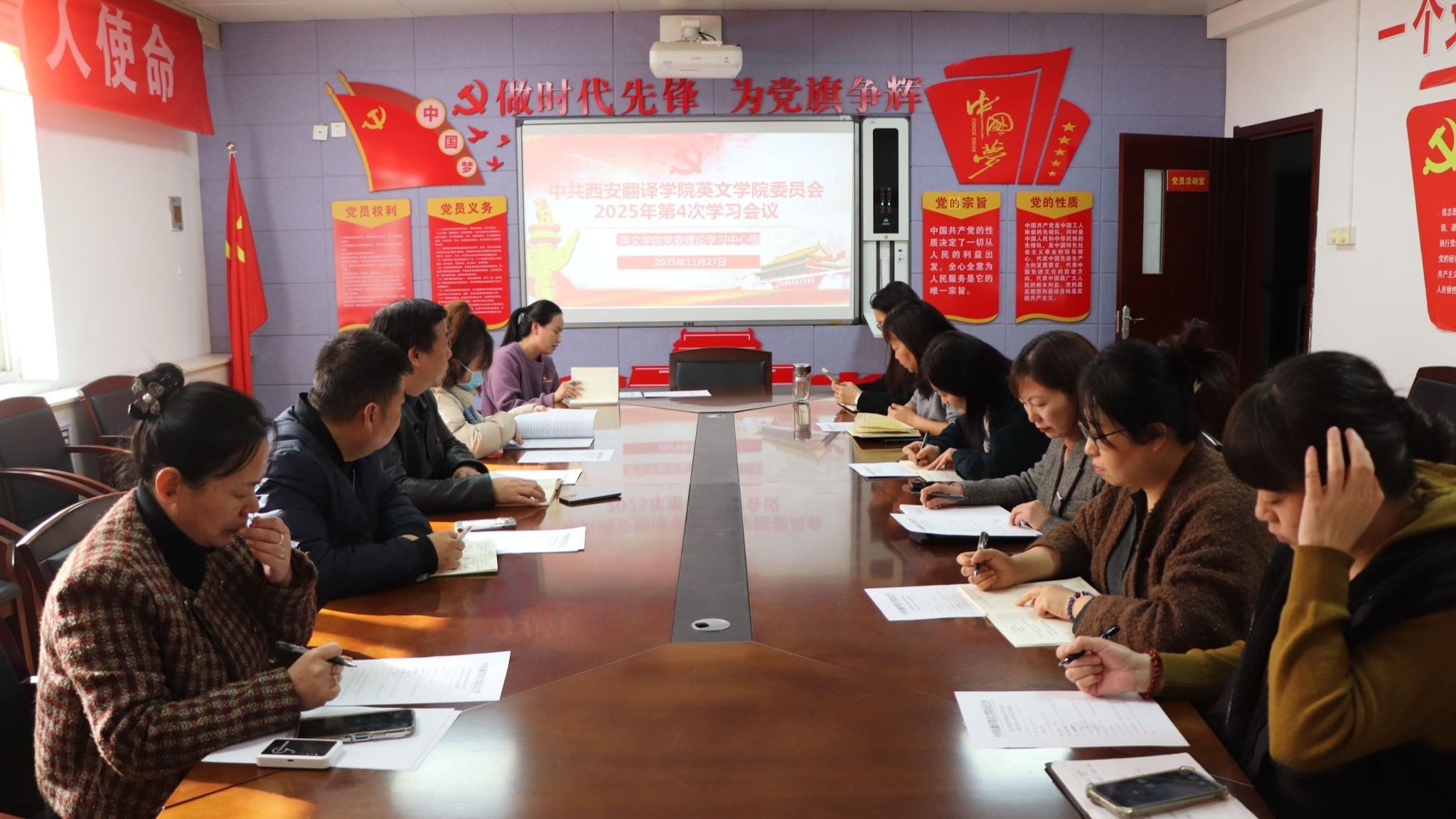 为深入学习贯彻党的二十届四中全会精神,将国家战略部署与高等教育育人使命紧密结合,切实把党的创新理论转化为培养时代新人的强大动力,西安翻译学院英文学院党委理论学习中心组于2025年11月27日14: 30在2304会议室召开第4次专题理论学习会。英文学院党委委员、各支部书记参会学习,会议由组织委员王慧慧主持。