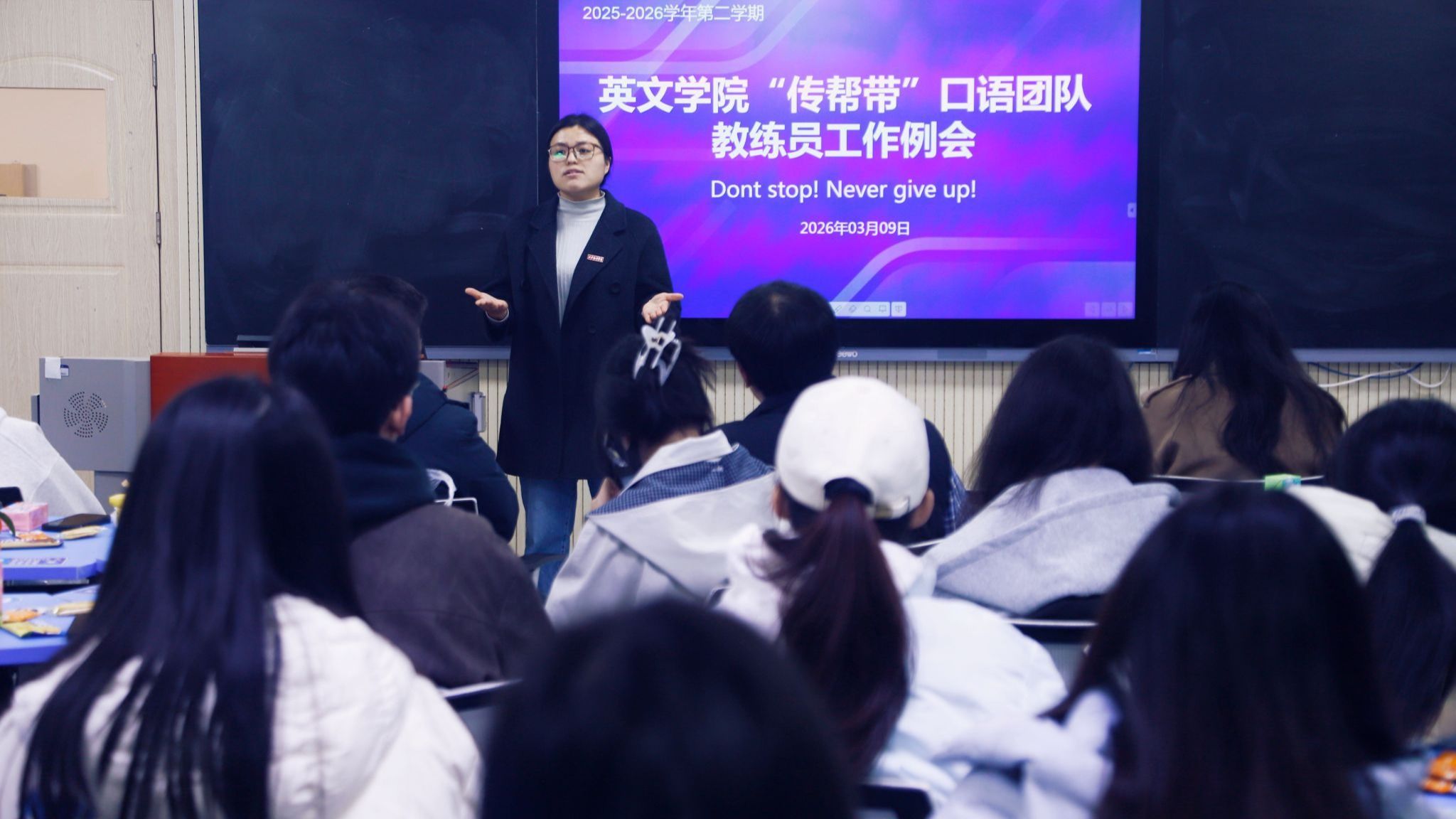 曾维民主任从学院整体工作出发,对上学期全覆盖式辅导模式进行复盘总结,客观分析了当前存在的辅导效率不高、成员负担较重等问题。他明确提出,本学期团队工作重心将从“普惠式服务大一新生”转向“重点提升团队自身口语能力”,同时为有真实提升需求的新生开展精准化、个性化辅导,切实提高辅导质量与效率。